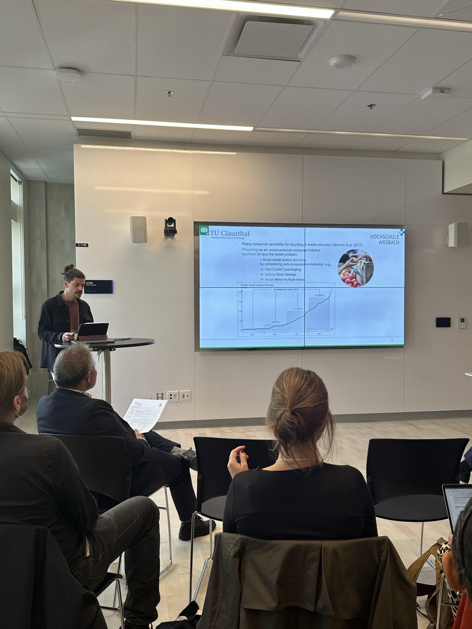 Frau Joana Disselhoff und Herr Dr. Julien Geissmar präsentierten aktuelle Forschungsergebnisse zu nachhaltigem Konsumverhalten sowie zu den Faktoren, die Konsumentscheidungen im Kontext von Nachhaltigkeit und Ressourcenschonung prägen.