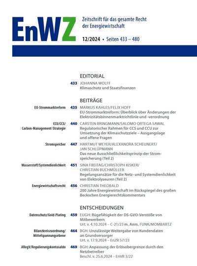 Der Beitrag Weyer/Scheunert/Schlüpmann, Das neue Ausschließlichkeitsprinzip der Stromspeicherung (Teil 2), ist erschienen in EnWZ 2024, S. 447 ff.